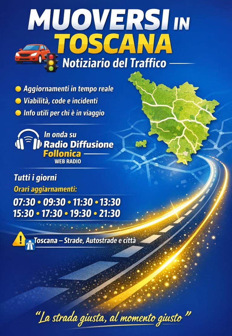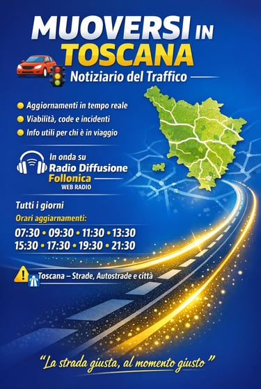 in collaborazione con il servizio di mobilità regionale 𝗠𝘂𝗼𝘃𝗲𝗿𝘀𝗶 𝗶𝗻 𝗧𝗼𝘀𝗰𝗮𝗻𝗮 , notiziari quotidiani sulla viabilità regionale .