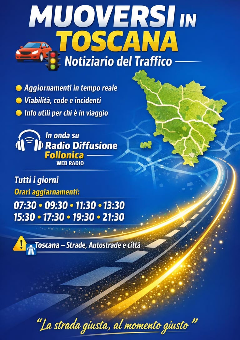 in collaborazione con il servizio di mobilità regionale 𝗠𝘂𝗼𝘃𝗲𝗿𝘀𝗶 𝗶𝗻 𝗧𝗼𝘀𝗰𝗮𝗻𝗮 , notiziari quotidiani sulla viabilità regionale .