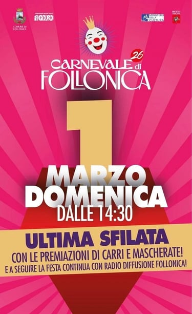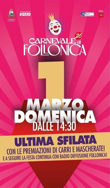 Domenica 1 Marzo 2026, ultima sfilata dei carri allegorici del Carnevale di Follonica 2026