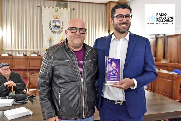 Il presidente dell’Associazione 𝐑𝐚𝐝𝐢𝐨 𝐃𝐢𝐟𝐟𝐮𝐬𝐢𝐨𝐧𝐞 𝐅𝐨𝐥𝐥𝐨𝐧𝐢𝐜𝐚 , Pietro Dragoni , insieme al sindaco della città di Follonica 𝑴𝒂𝒕𝒕𝒆𝒐 𝑩𝒖𝒐𝒏𝒄𝒓𝒊𝒔𝒕𝒊𝒂𝒏𝒊 , al ritiro della targa offerta dall’𝑨𝒔𝒔𝒐𝒄𝒊𝒂𝒛𝒊𝒐𝒏𝒆 𝑪𝒂𝒓𝒏𝒆𝒗𝒂𝒍𝒆 𝒅𝒊 𝑭𝒐𝒍𝒍𝒐𝒏𝒊𝒄𝒂 , per il contributo e partecipazione all’edizione n.59 della manifestazione carnevalesca .